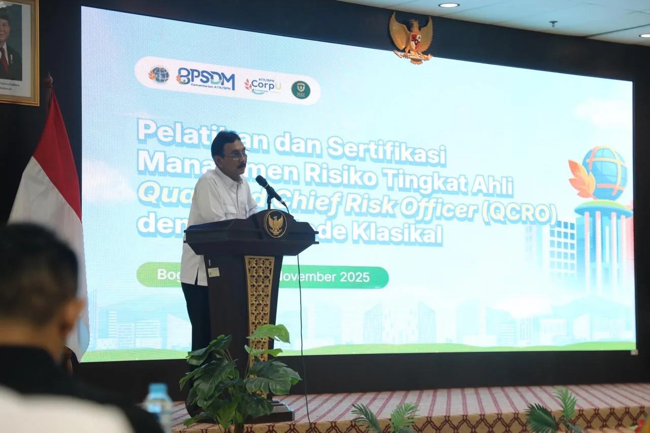 Cikeas – Kementerian Agraria dan Tata Ruang/Badan Pertanahan Nasional (ATR/BPN) menguatkan kapasitas jajarannya, terutama para pimpinan, dalam aspek pengambilan keputusan yang terukur dan berbasis risiko. Salah satu upaya dilakukan melalui Pelatihan Sertifikasi Manajemen Risiko Tingkat Ahli atau Qualified Chief Risk Officer (QCRO) bagi Pejabat Pimpinan Tinggi Pratama, yang diselenggarakan mulai 25-27 November 2025 di BPSDM ATR/BPN, Cikeas.
